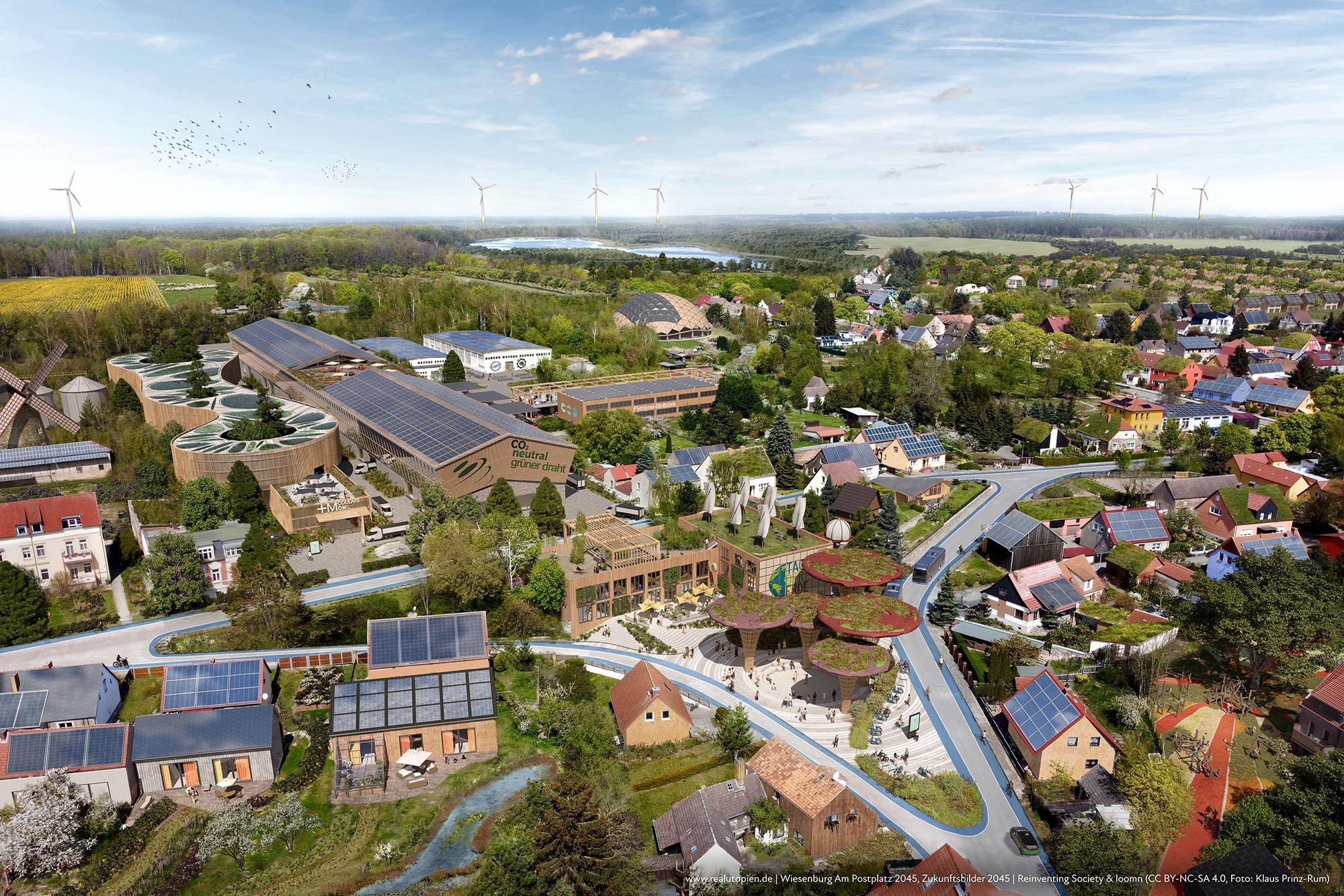 In Wiesenburg wurden in dieser Zukunftsvision alte Gewerbehallen in eine nachhaltige Industrie verwandelt mit einer Manufaktur für modulare Möbel, einer emissionsfreien Drahtfabrik und einer Pyrolyseanlage, in der Pflanzenabfälle zu Strom und Pflanzenkohle verarbeitet werden. Der vorher etwas verwahrloster Platz in der Mitte der Gemeinde wurde zu einem Begegnungszentrum mit Mobilitätshub und Agora.